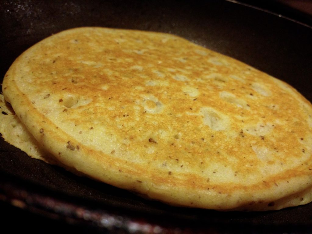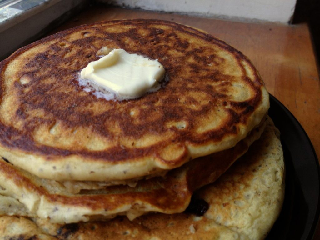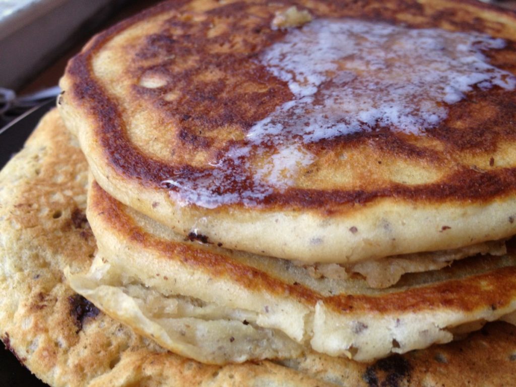 Chocolate chips are optional. When you want to feel like you’ve eaten a healthy breakfast without having to taste carrots, spinach, oatmeal, flaxseed, whey protein powder…etc…just make some delicious pancakes. What’s great about oatmeal (in pretty much anything) is that it gets all mushy when blended well into the dishes you prepare – especially batter. Flaxseed, yes you can see it, but you can’t taste it.